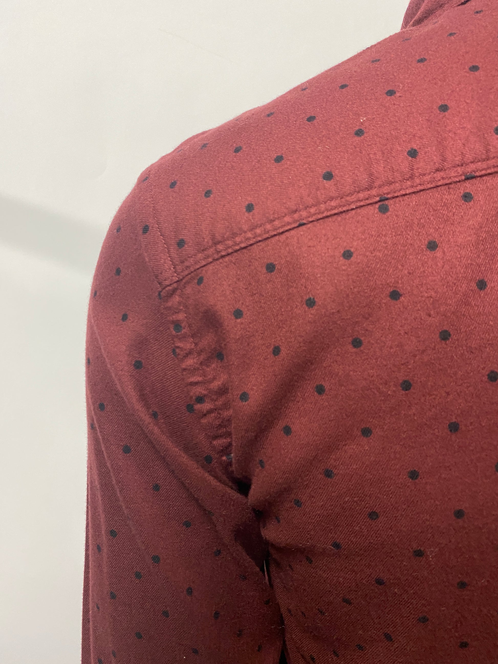 A new soft touch cotton shirt in deep burgundy red with polka dots throughout and grey branded buttons to fasten both at the front and cuffs.