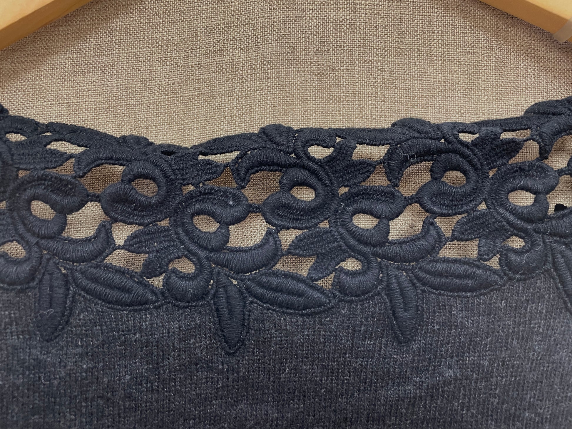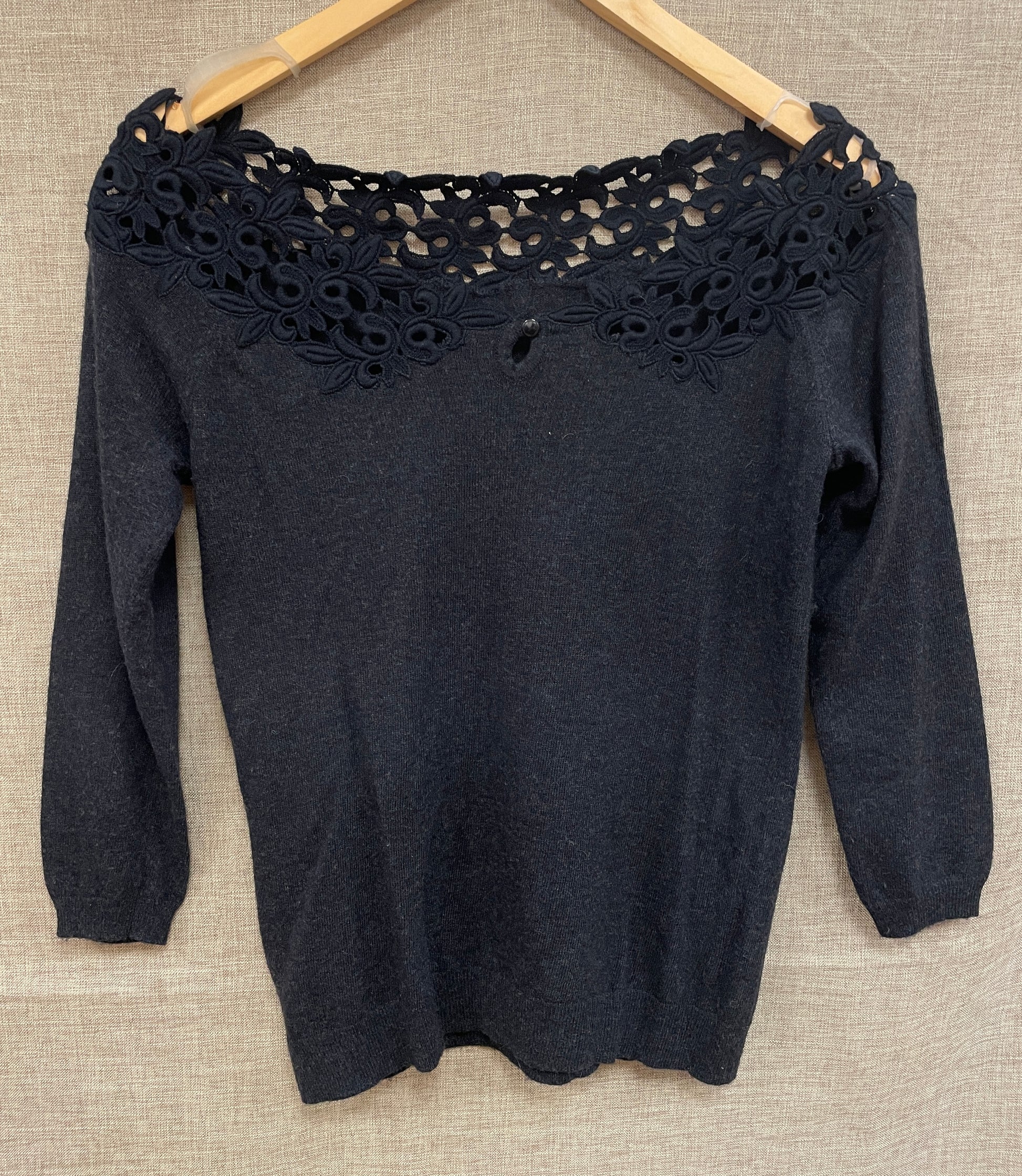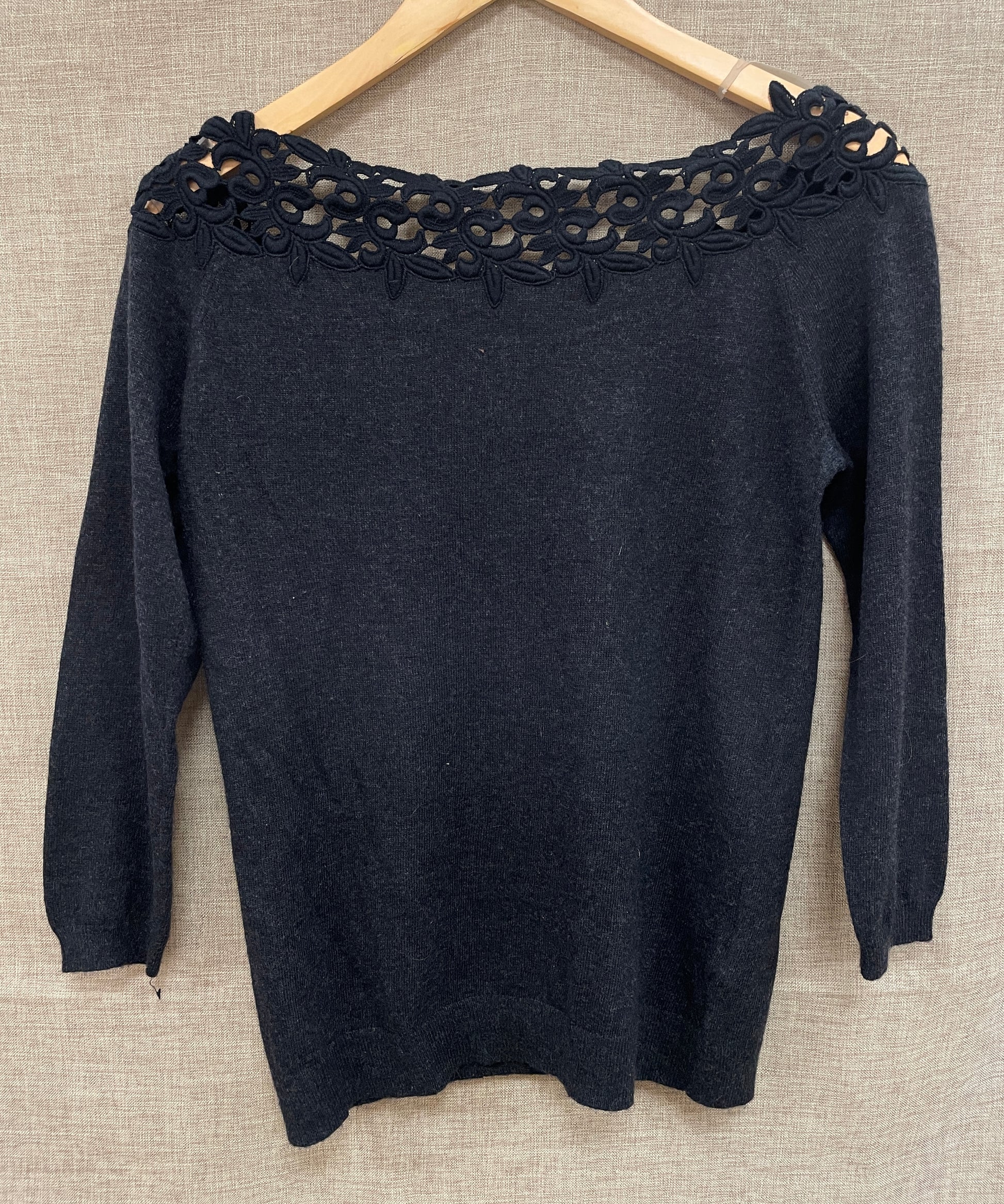 3/4 length sleeve lightweight jumper with black cotton lace detail at neckline. Dark grey marl knit. Single button at back.