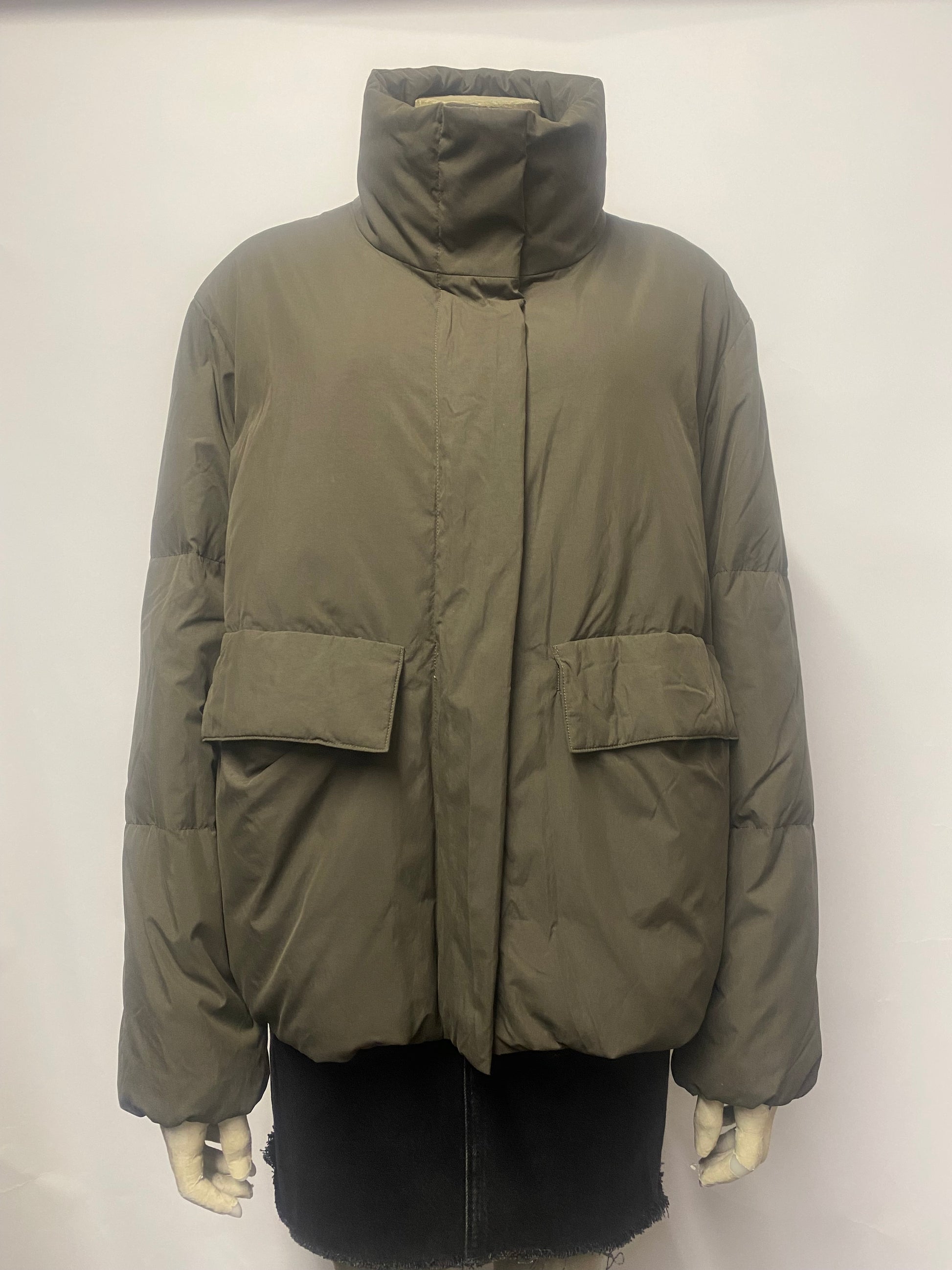 Khaki matte down filled puffer jacket. Featuring a high collar with snap fastenings, main zip fastening with cover, two front flap pockets and cord adjustable hem.
