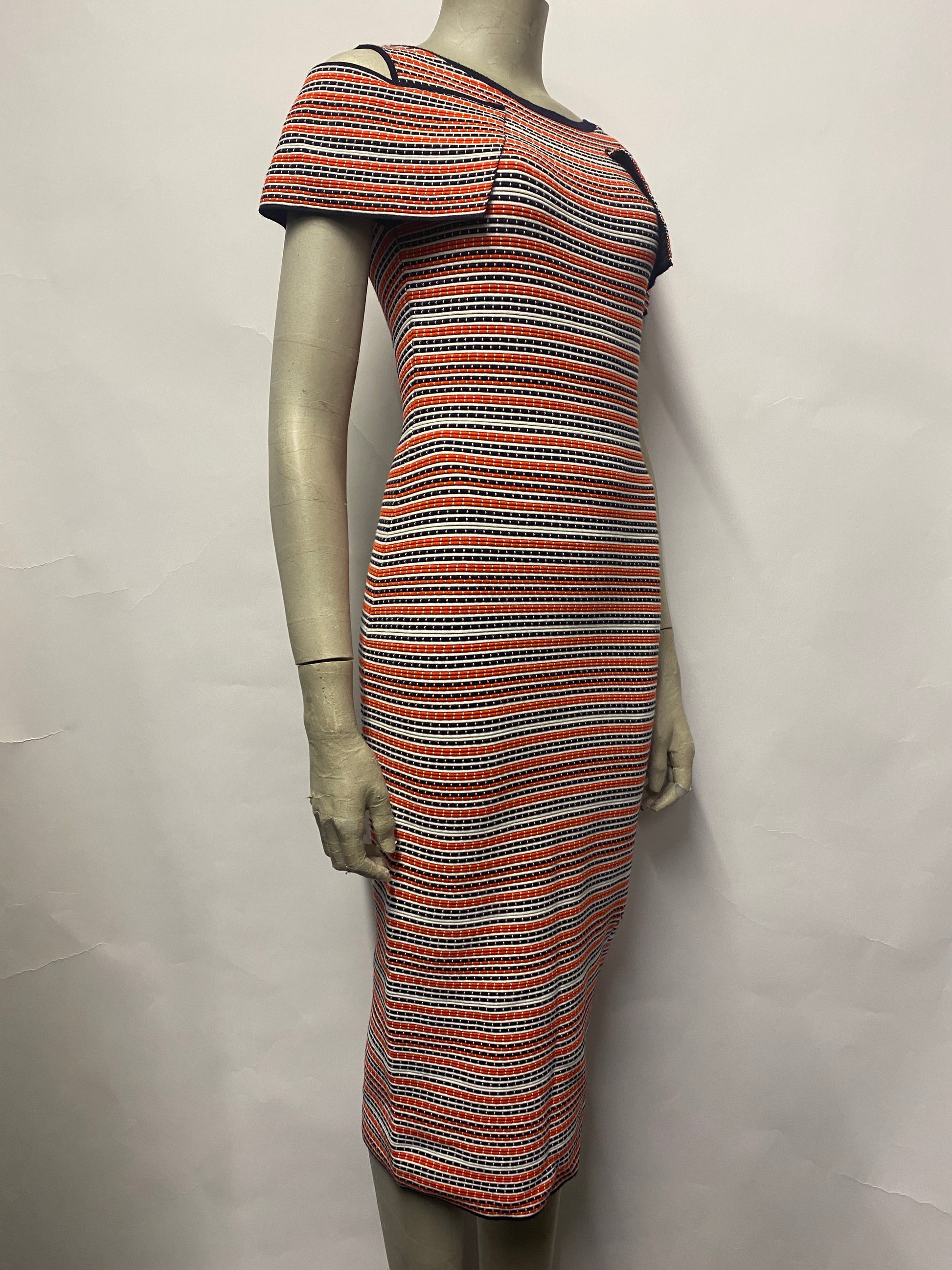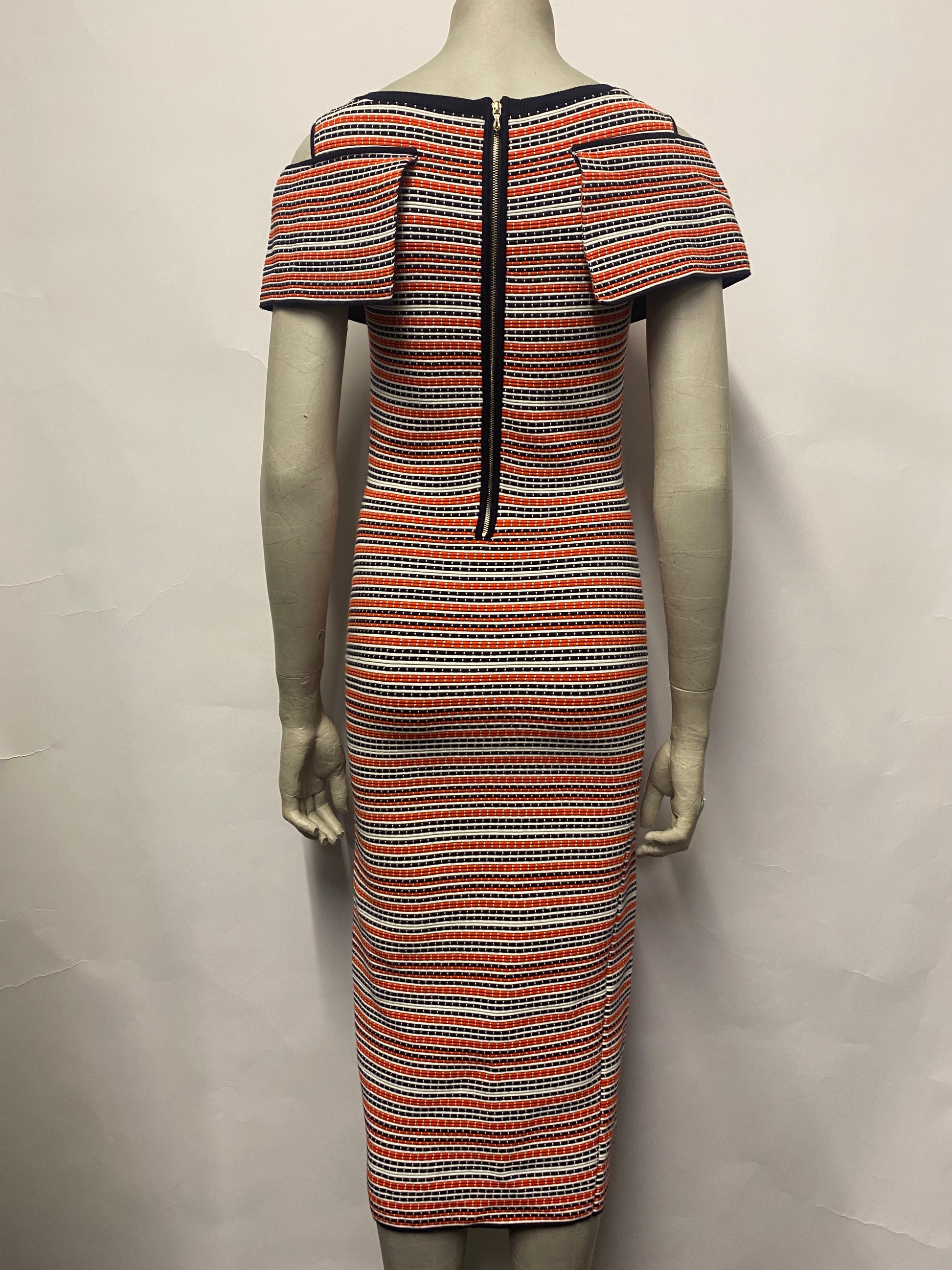 Knitted striped dress, cold shoulder with capped sleeves, zip fastening at back.