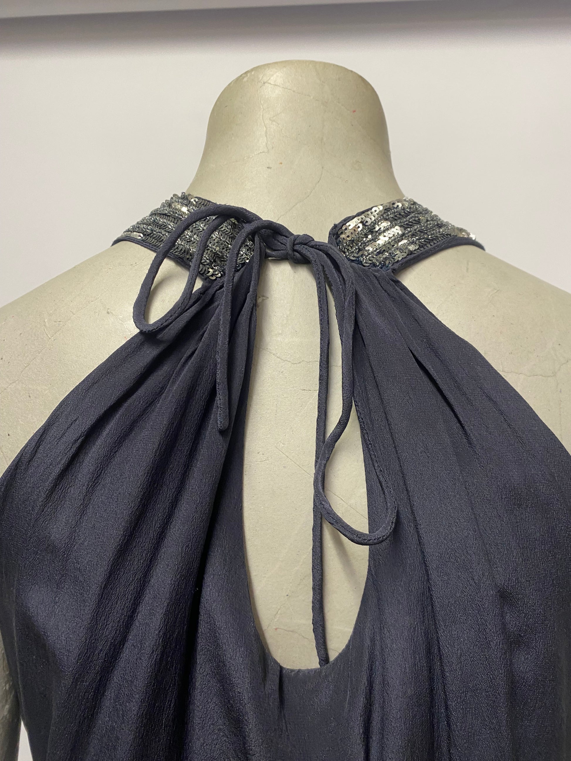 Silk jumpsuit in a dark navy silk embellished with beads and sequins. Plunging V-neck, elasticated waist at back, neck tie, asymmetric skirt panel to front.