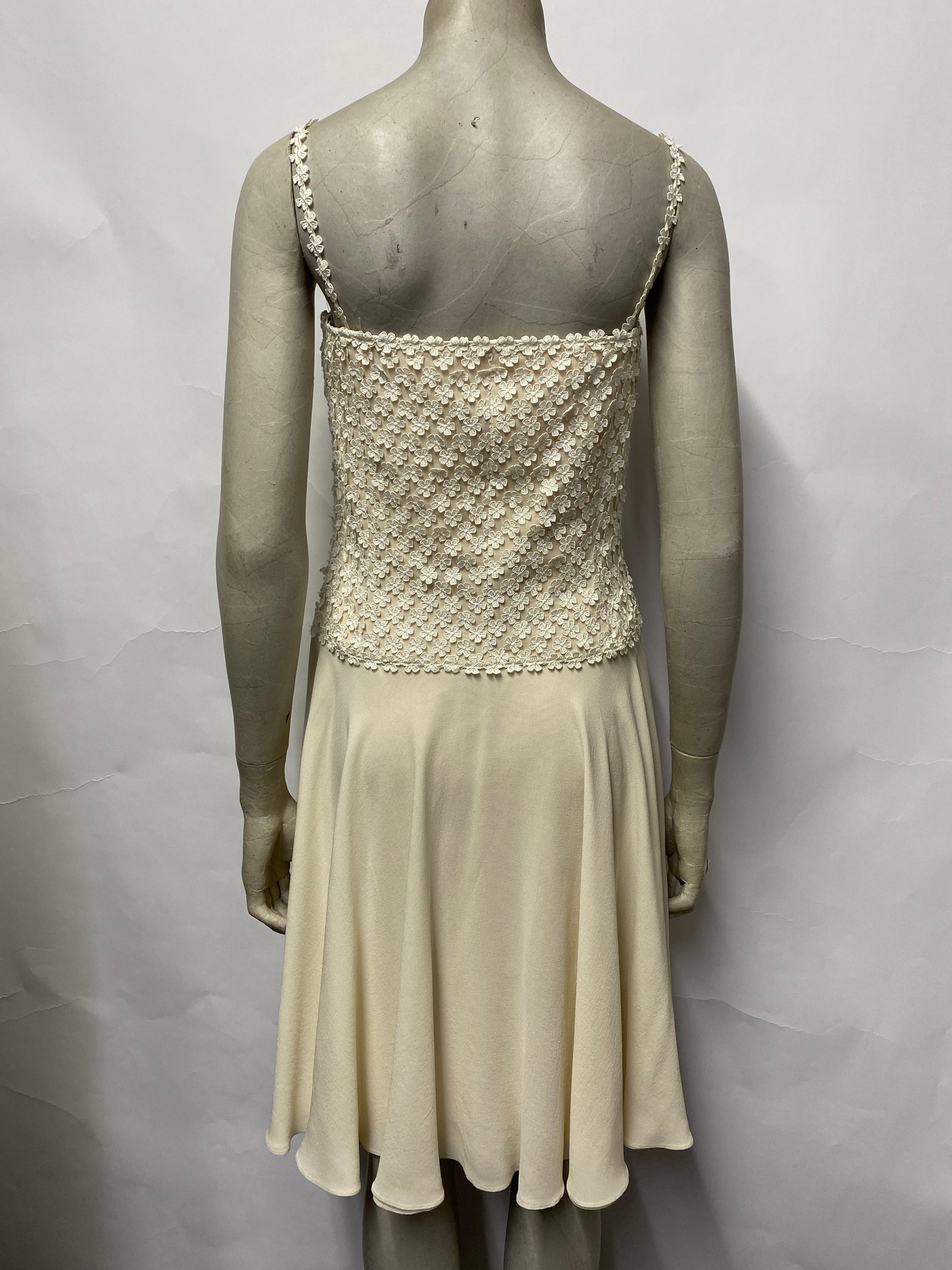 Strapy mid-length silk dress with fitted flower detail body and flowy A-line skirt. Concealed zip fastening on the side. 10 UK