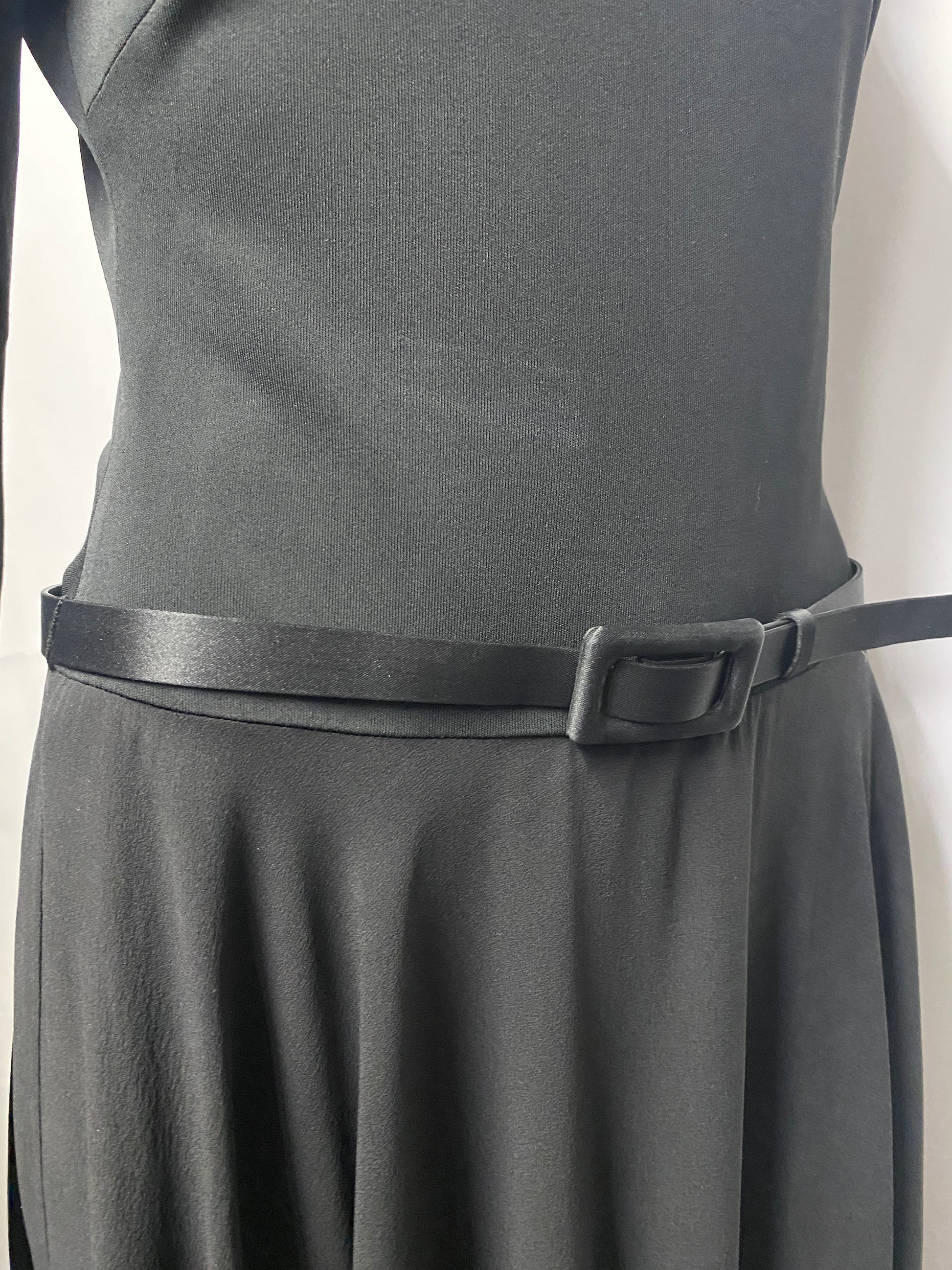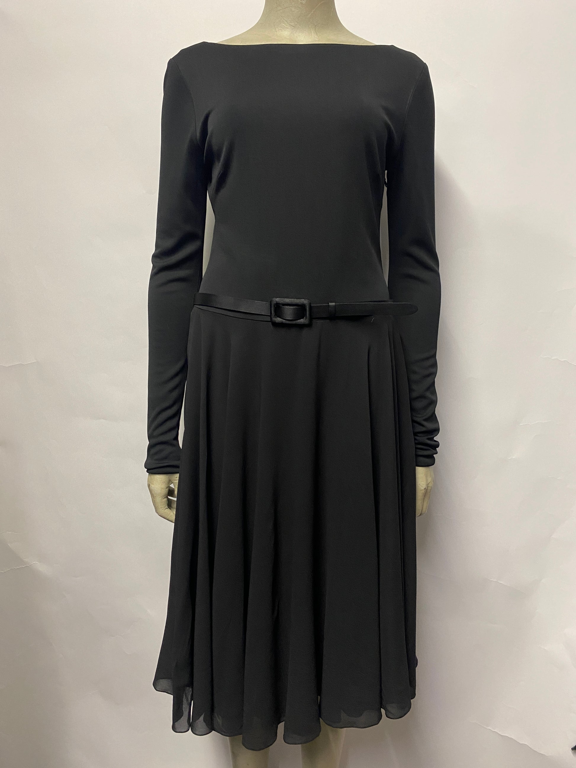 Sleek black dress from Ralph Lauren Purple Collection, with long sleeves, boat neck-line, V shape at back and cinched with a belt at the waist.
