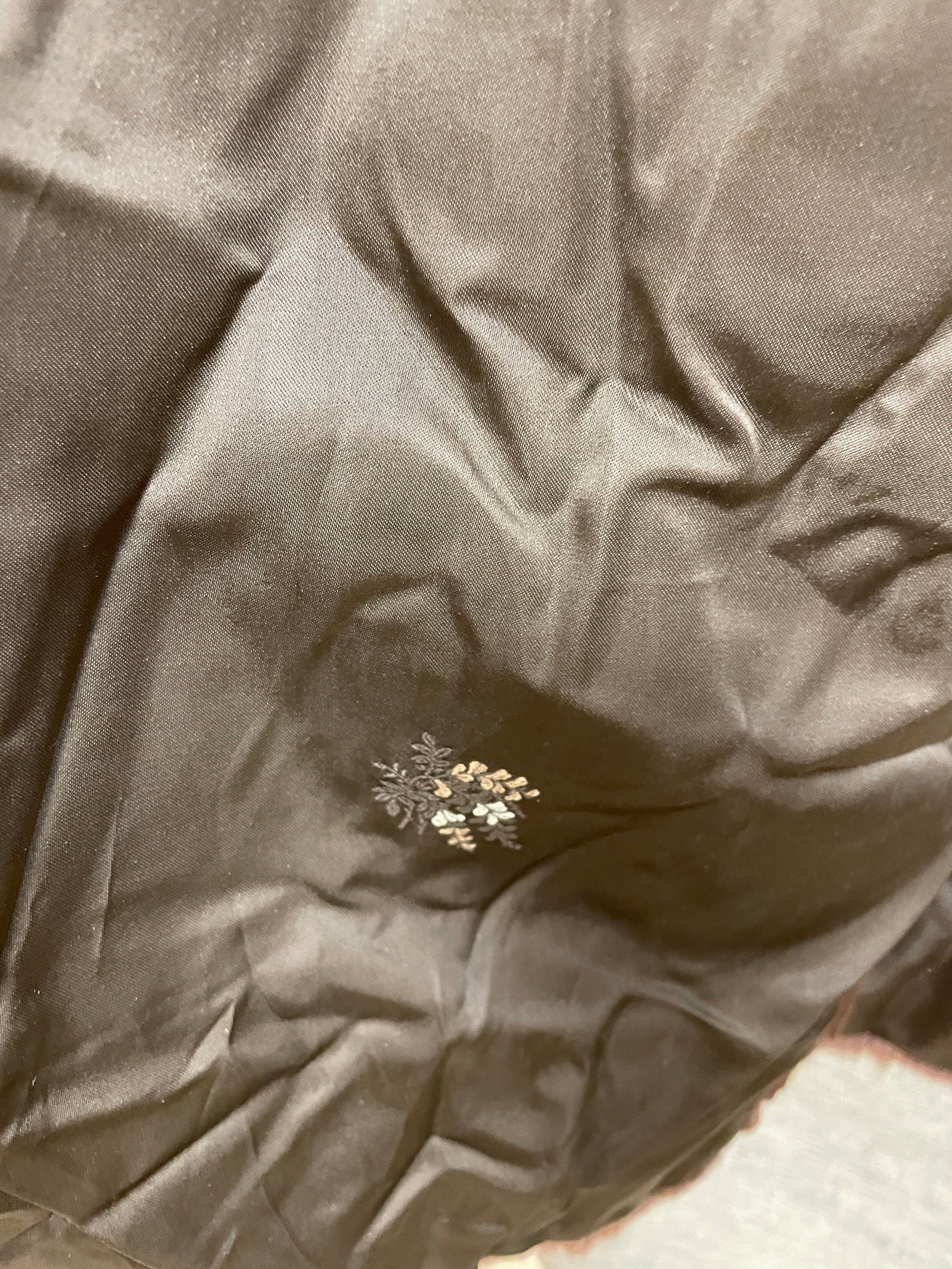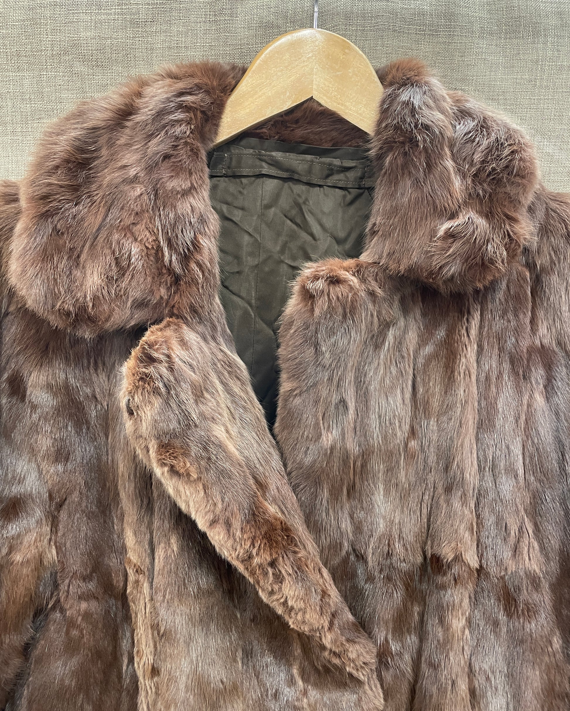 Brown faux fur coat, possibly vintage. Missing all labels. Lined with embroidered floral design. 2 side pockets and concealed fastenings. Very soft fabric.