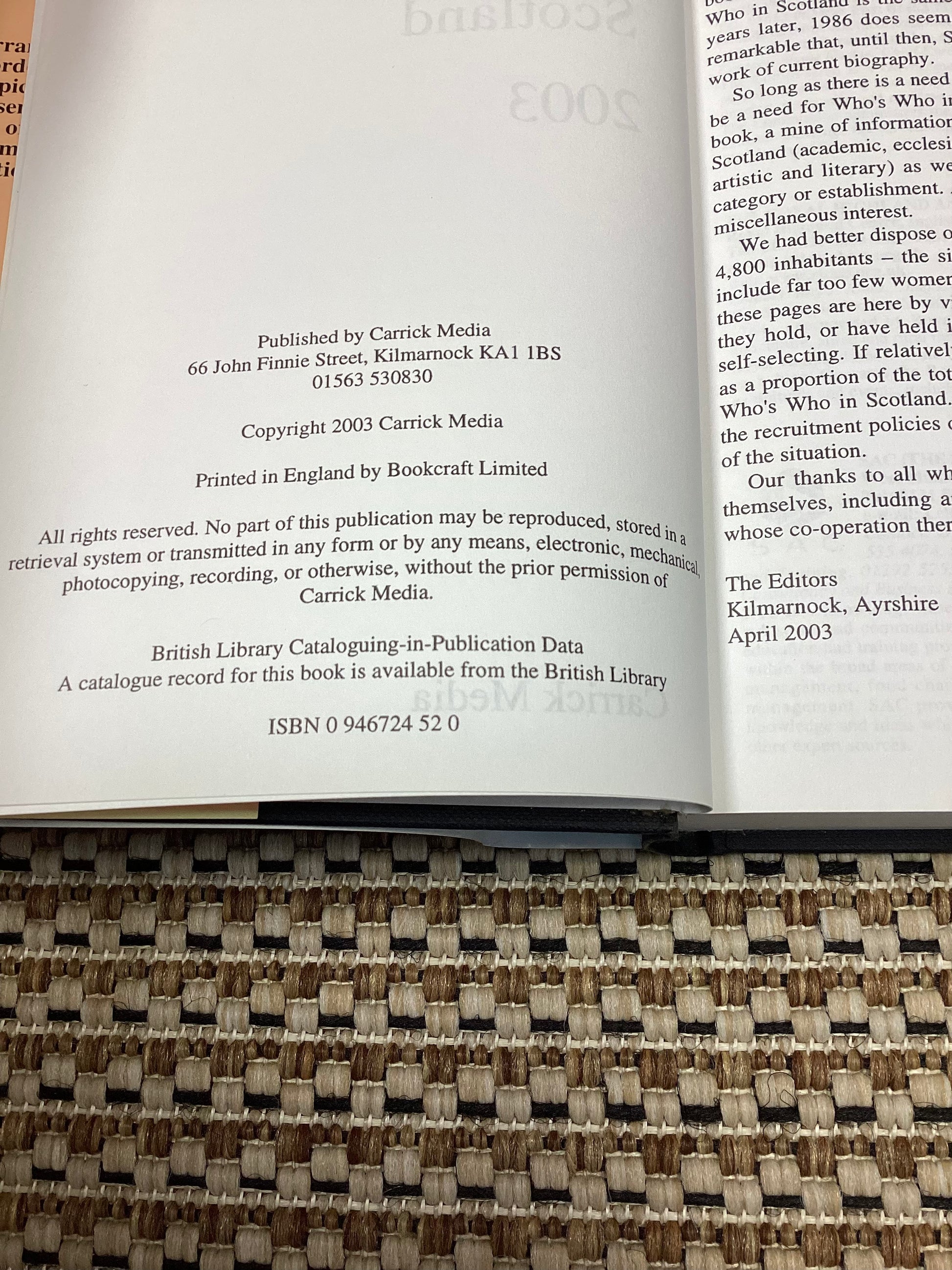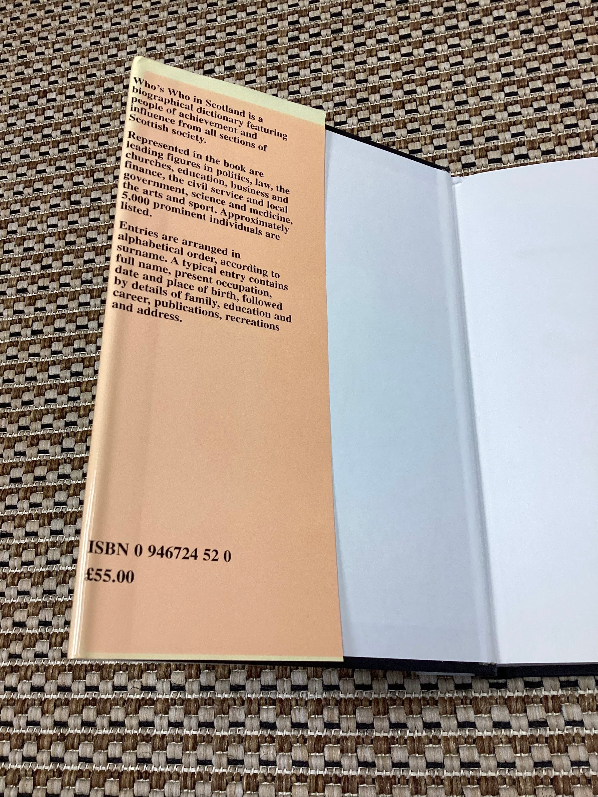 Hardback edition of Who's Who in Scotland 2003 by an anonymous author. A biographical dictionary.